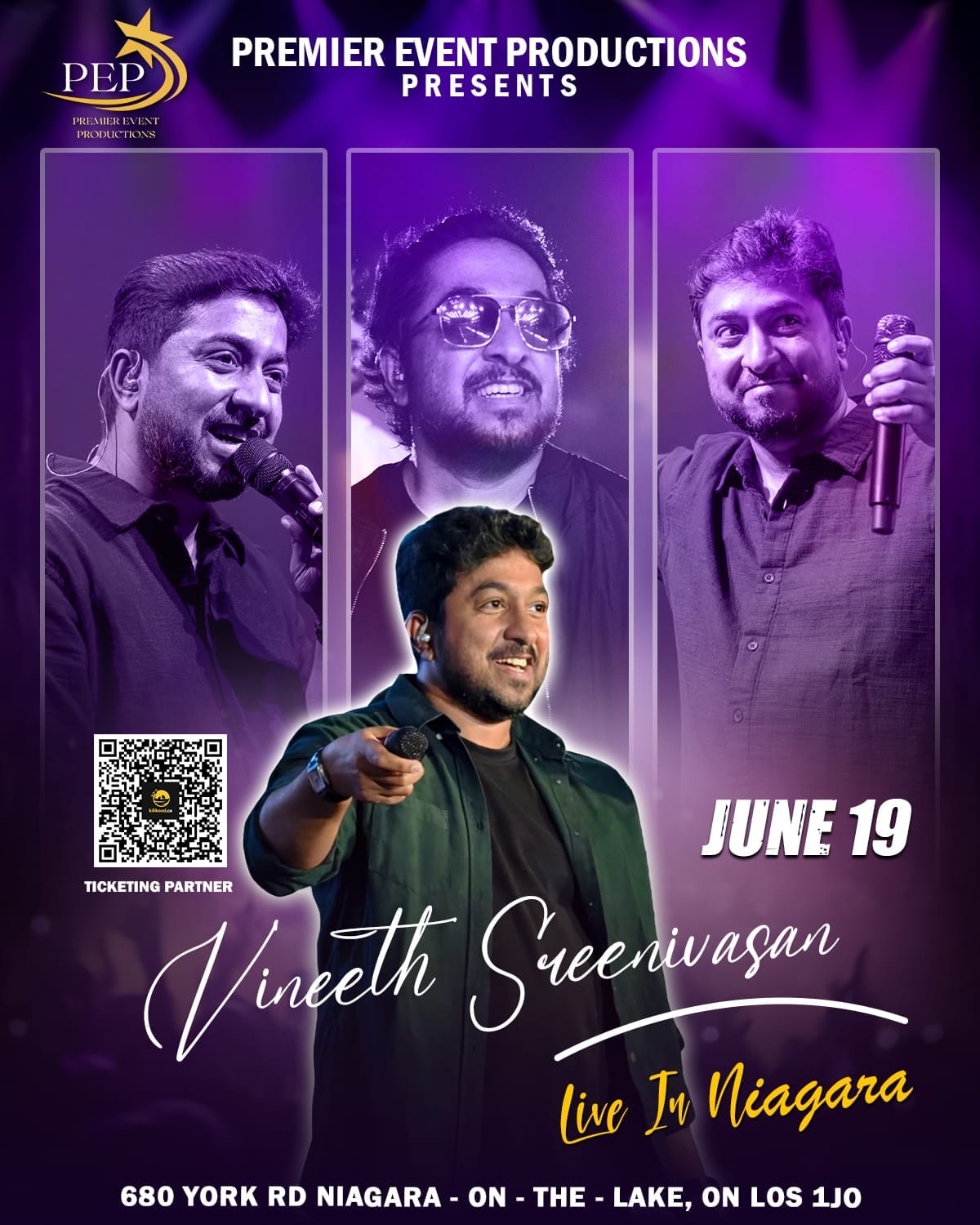 ✨ Don’t miss this rare chance to experience Vineeth Sreenivasan Live in Niagara – where music meets magic.